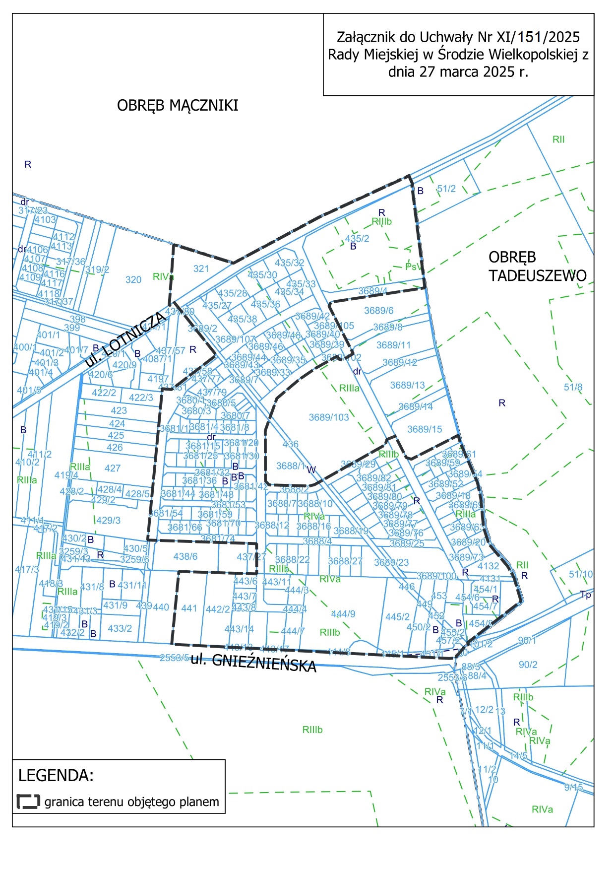 Na podstawie art. 17 pkt 1 ustawy z dnia 27 marca 2003 r. o planowaniu i zagospodarowaniu przestrzennym (Dz. U. z 2024 r. poz. 1130 ze zmianami) zawiadamiam o podjęciu przez Radę Miejską w Środzie Wielkopolskiej Uchwały Nr XI/151/2025 z dnia 27 marca 2025 r., w sprawie przystąpienia do sporządzenia miejscowego planu zagospodarowania przestrzennego terenu położonego w Środzie Wielkopolskiej, pomiędzy ul. Lotniczą i ul. Gnieźnieńską.